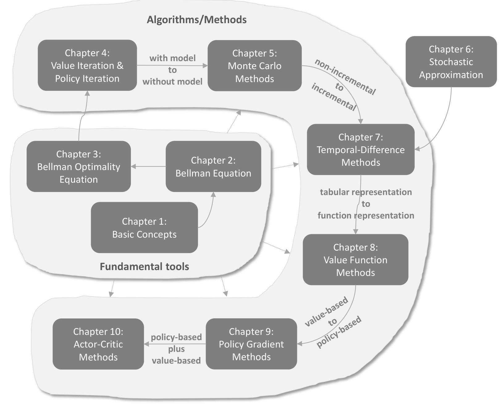 Up to this point, the reader may have noticed that the contents of these chapters are highly correlated. For example, if we want to study the MC algorithms (Chapter 5), we must first understand the policy iteration algorithm (Chapter 4). To study the policy iteration algorithm, we must first know the value iteration algorithm (Chapter 4). To comprehend the value iteration algorithm, we first need to understand the Bellman optimality equation (Chapter 3). To understand the Bellman optimality equation, we need to study the Bellman equation (Chapter 2) first. Therefore, it is highly recommended to study the chapters one by one. Otherwise, it may be difficult to understand the contents in the later chapters.
