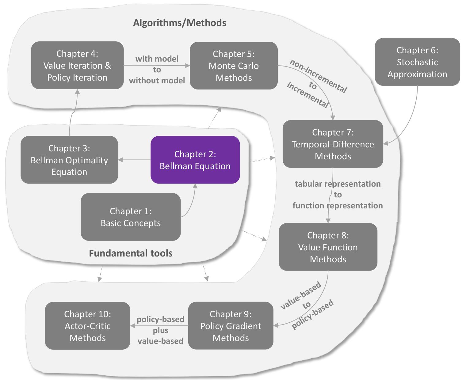 Another important concept, action value, was introduced to describe the value of taking one action at a state. As we will see later in this book, action values play a more direct role than state values when we attempt to find optimal policies. Finally, the Bellman equation is not restricted to the reinforcement learning field. Instead, it widely exists in many fields such as control theories and operation research. In different fields, the Bellman equation may have different expressions. In this book, the Bellman equation is studied under discrete Markov decision processes. More information about this topic can be found in [2].